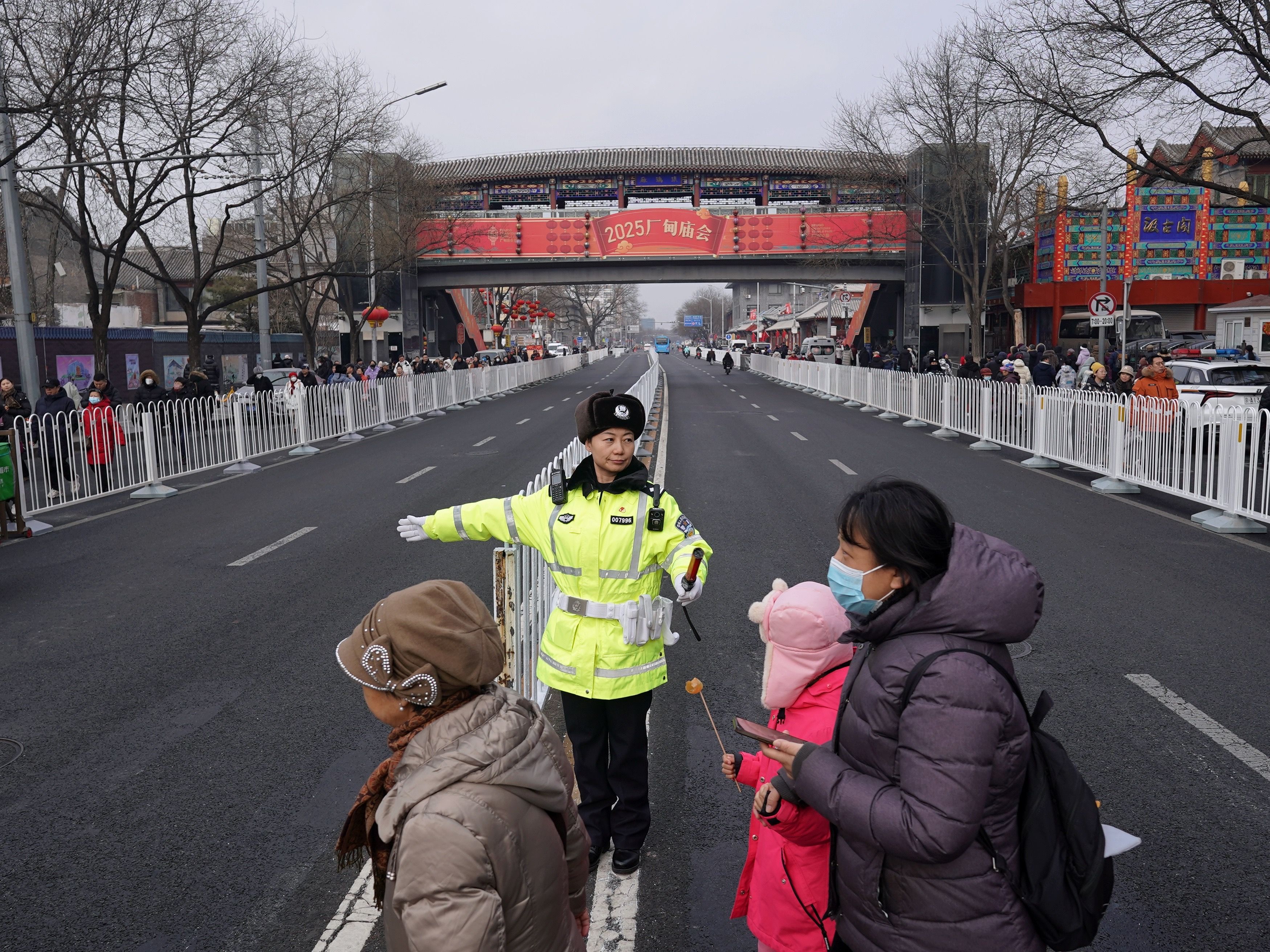 厂甸庙会期间,南新华街的和平门至虎坊桥路段采取交通管制措施,李宁正在现场疏导交通。新京报记者 王贵彬 摄