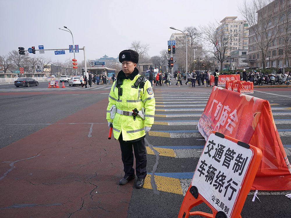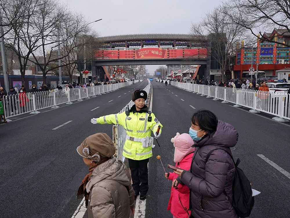 今年春节假期,主打传统文化的“文庙会”厂甸庙会吸引了大量市民游客前来体验打卡,为了确保交通安全,南新华街的和平门至虎坊桥路段禁止机动车通行。在南新华街上的一处临时路口上,现场交警还加强了疏导保障,确保游人安全。图为2月1日,西城交通支队广安门大队大队长李宁正在现场疏导交通。