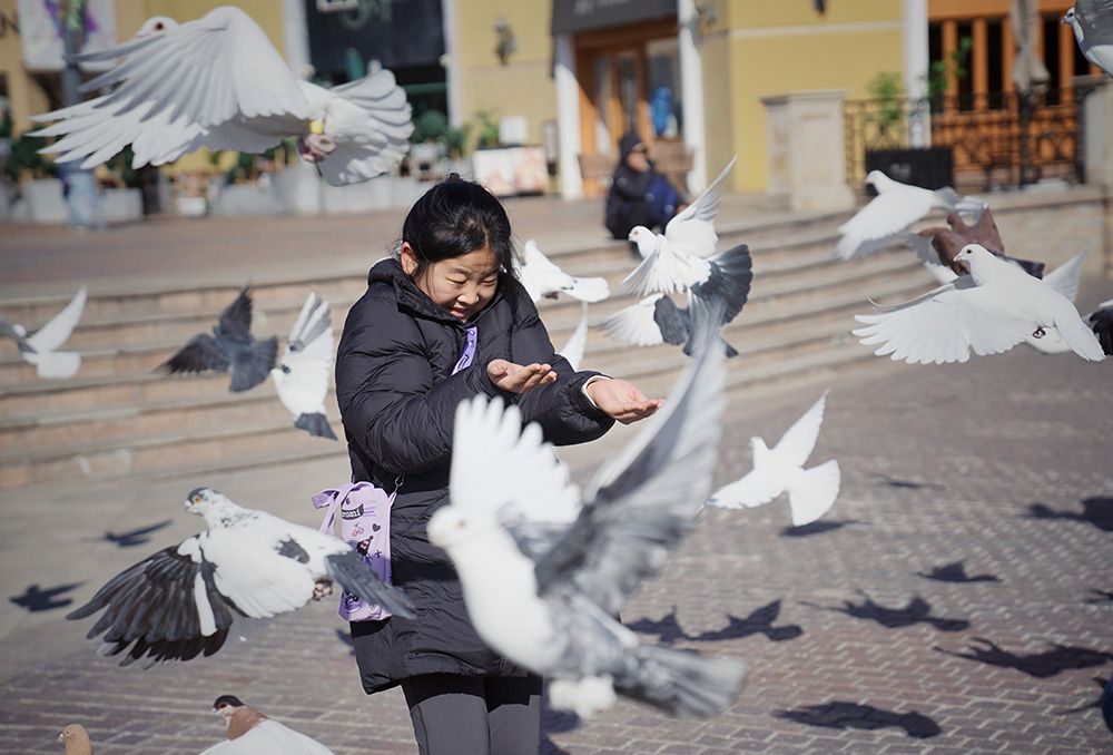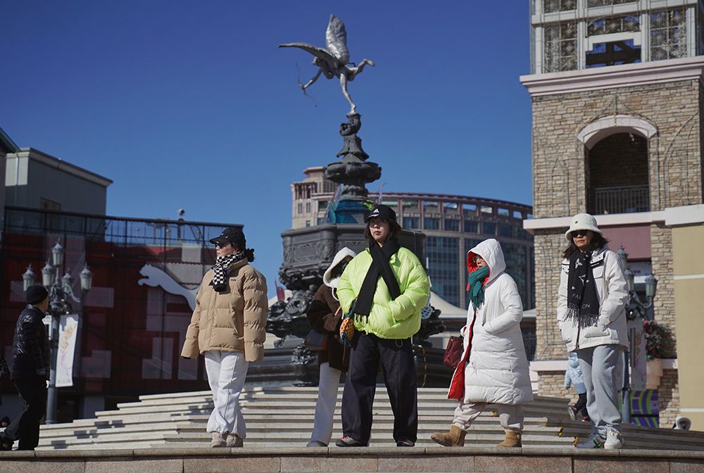蓝色港湾,市民们在大风中逛街。北京市气象台预计,受冷空气影响,今天白天有3、4级偏北风,阵风6、7级,山区阵风可达8级以上,北京市气象台已发布大风蓝色预警信号。今天白天气温比昨天有所下降,午后最高气温2℃上下,风寒效应显著,体感温度全天都在0℃以下。