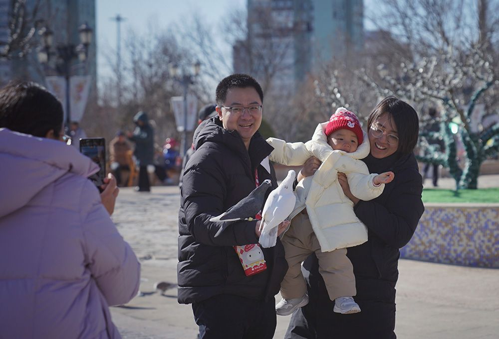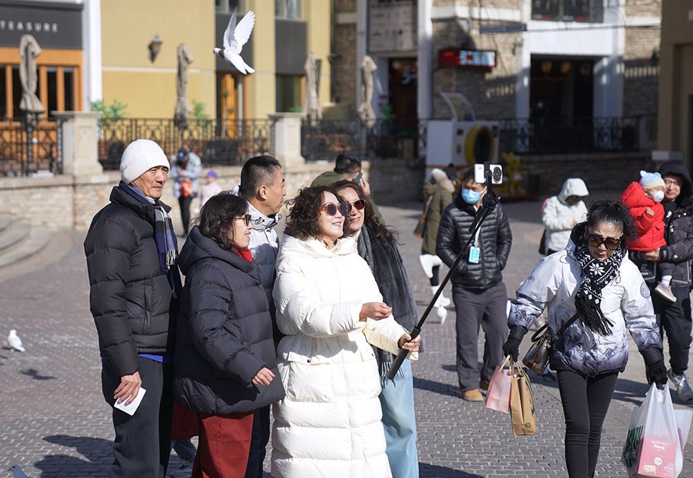 2月3日,大年初六,蓝色港湾,市民举着手机自拍合影。春节假期倒数第二天,市民们逛街、会友,享受假期。
