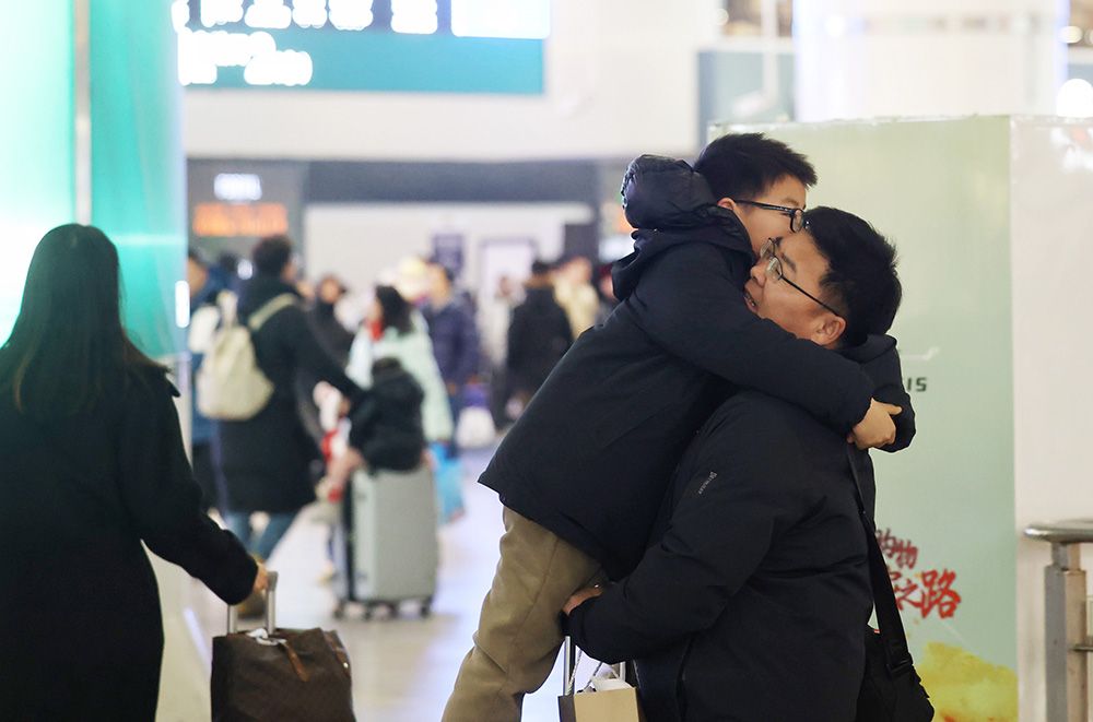 北京南站出站口,小朋友与家人拥抱。在春运返程阶段,地铁4号线、14号线启动了延时运营,无缝衔接深夜抵达客流。