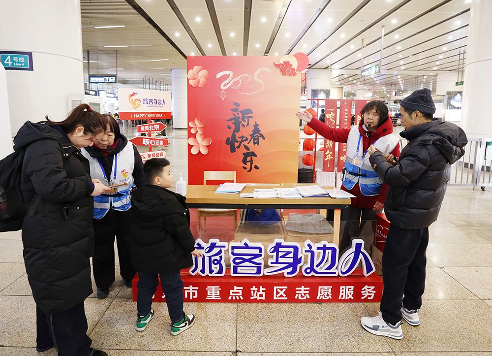 北京南站在换乘区域设置3个志愿服务点位,服务旅客出行。