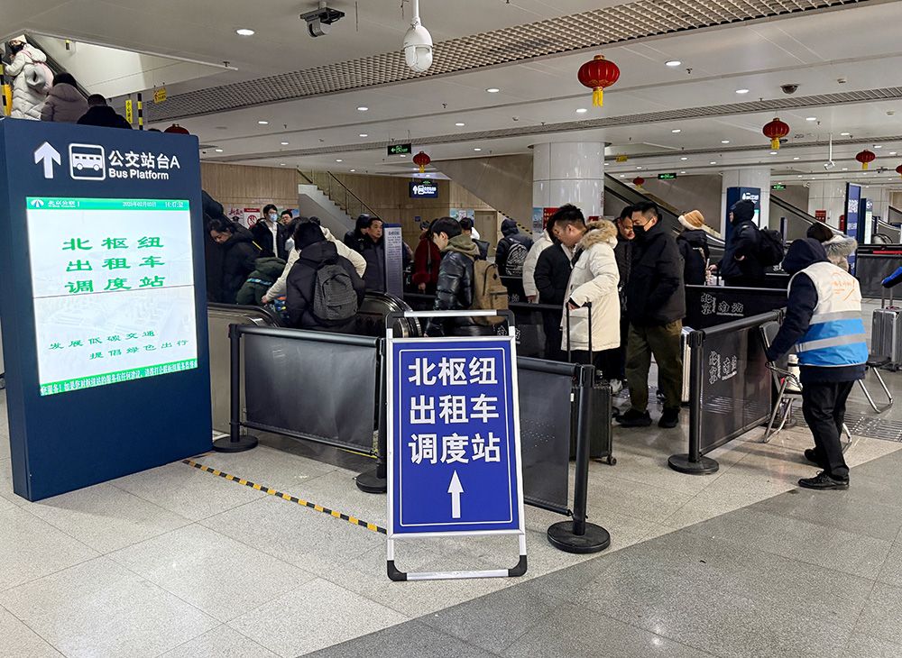 北京南站北枢纽的出租车调度站排队候车的旅客数量相对较少,出站旅客可以选择来此处候车。