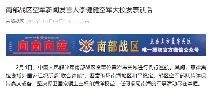 新京报讯 据南部战区微信公众号消息,2月4日,中国人民解放军南部战区空军位黄岩岛空域进行例行巡航。其间,菲律宾拉拢域外国家组织所谓“联合巡航”,蓄意破坏南海地区和平稳定。战区空军部队持续保持高度戒备,坚决捍卫国家领土主权和海洋权益,任何搅局南海的军事活动尽在掌握。