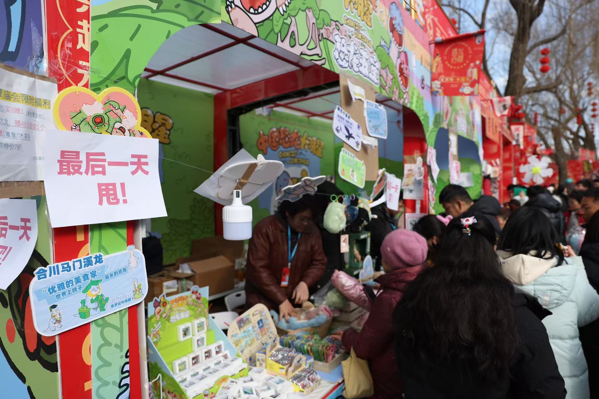 龙潭庙会到今日下午17:00时止。许多商品开始打折,摊主挂出最后一天甩卖的纸条。
