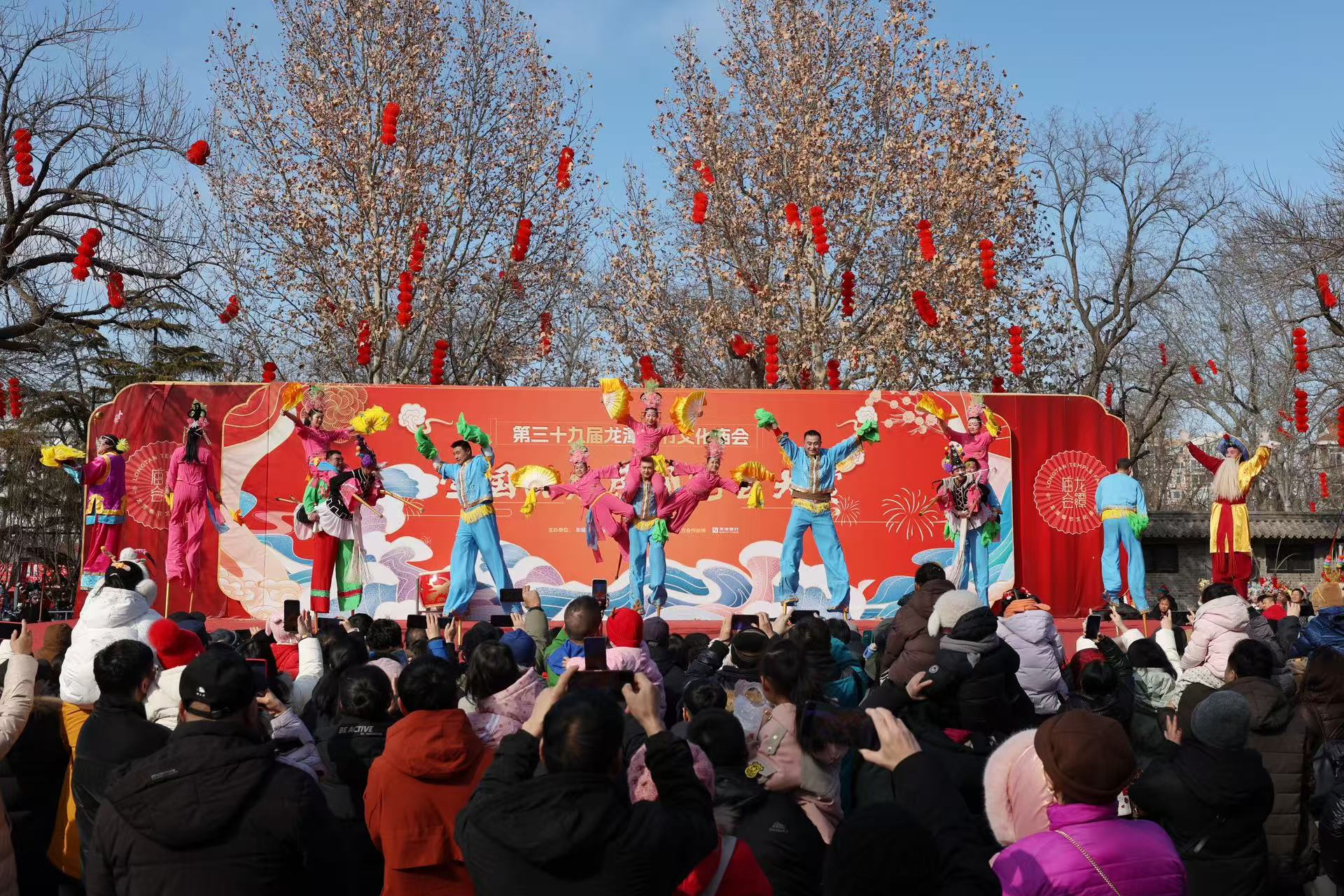 龙潭庙会,踩高跷表演吸引不少游客观看。