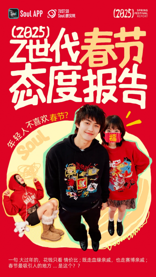 从这份《2025 Z世代春节态度报告》中,我们可以看到Z世代对春节的独特态度和行为习惯。他们并没有对传统春节失去兴趣,而是通过赋予春节新的元素,如数字红包、线上拜年等,为这个传统节日注入了新的活力和时代感。Soul作为深受年轻人喜爱的社交平台,在春节期间成功“赛博亲戚”们互动的重要平台,这个春节,记得来Soul“走走亲戚”。