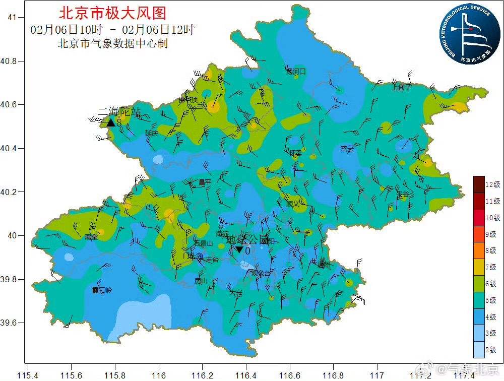 北京市气象台预计,中午前后阵风风力明显加大至7级左右,14时至半夜(23时)前后阵风风力维持在8、9级 。