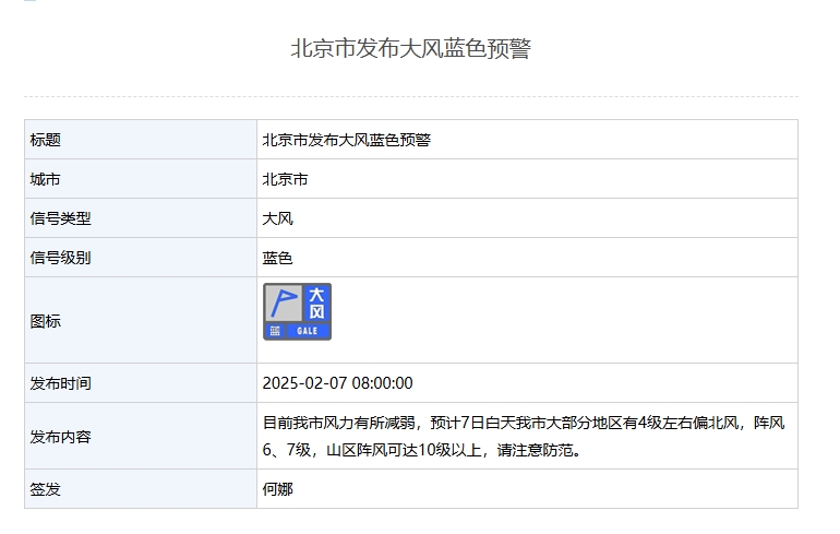 新京报讯 据北京市气象局消息,北京市发布大风蓝色预警,目前我市风力有所减弱,预计7日白天我市大部分地区有4级左右偏北风,阵风6、7级,山区阵风可达10级以上,请注意防范。