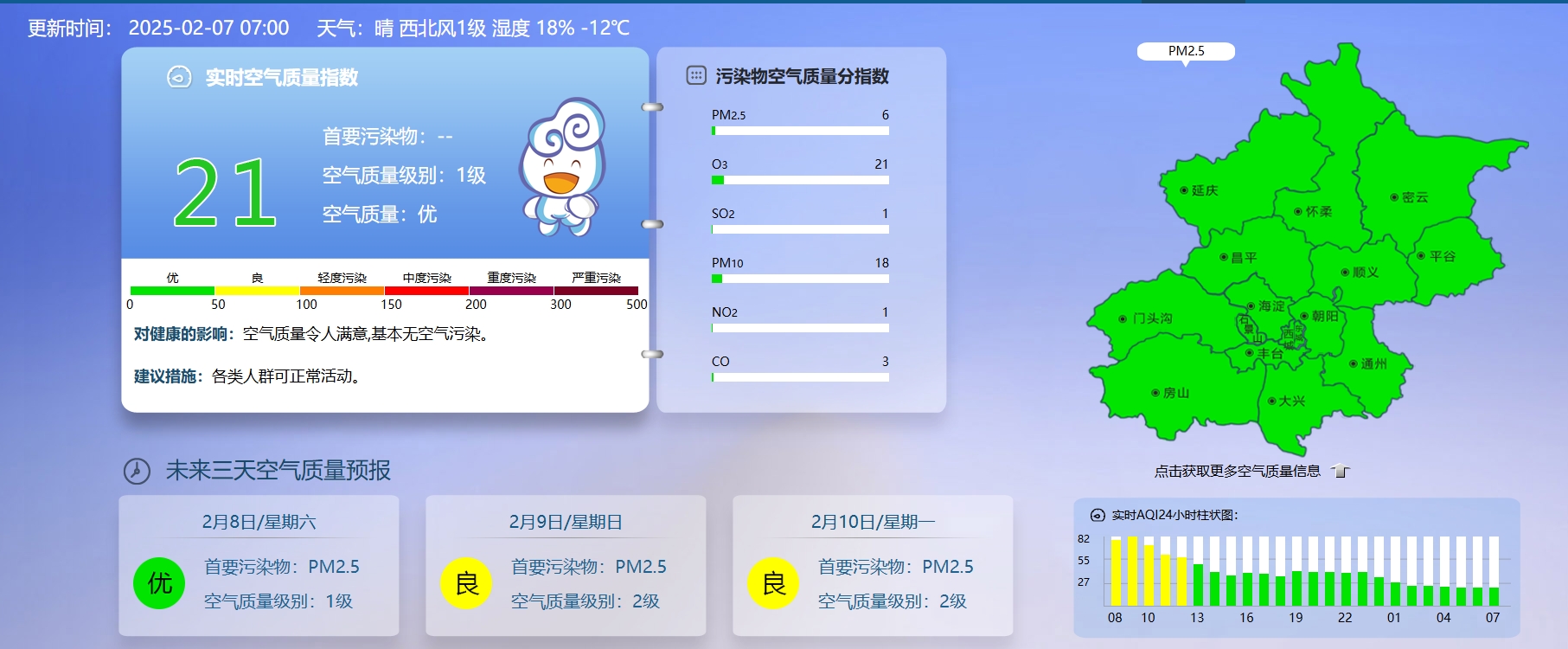 据北京市生态环境监测中心今早7时数据,目前实时空气质量指数21,空气质量优。