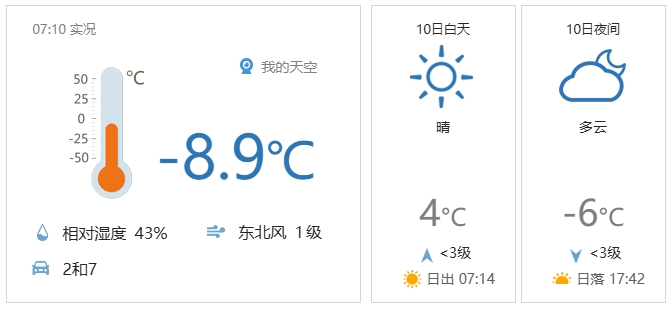 今天白天晴,北转南风二级左右,最高气温4℃;夜间晴转多云,南转北风一二级,最低气温-6℃。