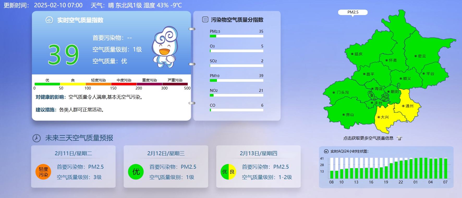 据北京市生态环境监测中心今早7时数据,目前实时空气质量指数39,空气质量优。