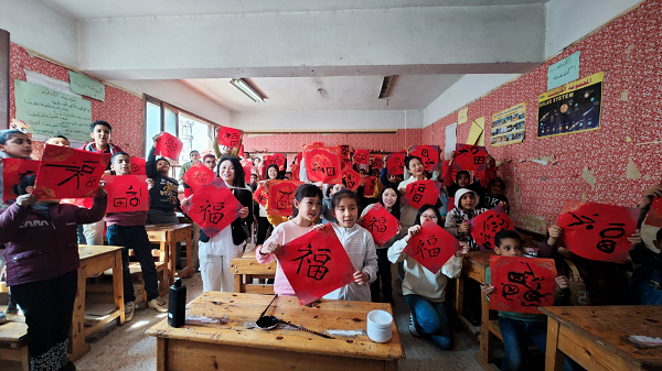 长途跋涉,历经波折,追觅人终于抵达埃及学校。在不足20平的教室里,50多个孩子与中国小朋友一起写 “福” 字,感受中华文化的熏陶。孩子们睁大好奇的双眼,聆听科技课堂,体验AI魅力。这一刻,地域与文化的界限消失,希望的种子在欢声笑语中播撒。