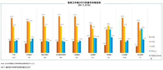 这份报告显示,中国三级医院的医师平均每周工作51.05 小时,二级医院的医师平均每周工作 51.13 小时。在春节小长假,仅有12% 的受访者表示能够完全按照国家法定假期进行休假。而超过48% 的被访者称休假天数不足4天,其中,49.2%主治医师及以下级别的医生春节休假不足4天。