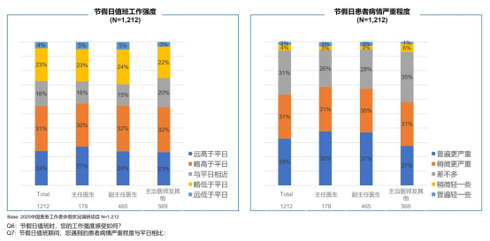 节假日接诊患者数量增多、值班人员减少、病患病情更严重等原因,直接影响着医务工作者的工作强度。报告显示,24%的医生认为节假日值班期间工作强度高于平时,31%的医生认为患者数量略高于平时,仅4%的医生认为节假日工作强度低于平时。33%的医生认为节假日就诊的病患普遍病情更严重,仅2%的医生认为普遍更轻一点。