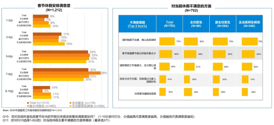 参与调研的医生对目前按休假安排的整体满意度是5.8分(满分10分),民营医院是6.1分。从不满意的原因来看,72%的医生表示主要是因为“调休制度不完善,难以实现调休”,60%的医生表示“春节等重要节假日休假天数太少”。