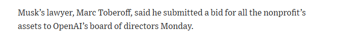 马斯克的律师马克·托贝罗夫称,已向OpenAI董事会提交了该收购要约。