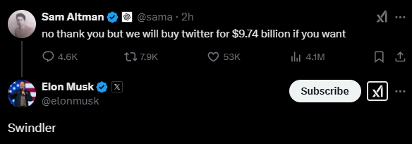 OpenAI首席执行官萨姆·奥尔特曼对此表示拒绝。奥尔特曼在社交媒体X上发帖称:“不了,谢谢。但如果你愿意的话,我们可以花97.4亿美元收购推特。”马斯克随后回复称奥尔特曼是“骗子”。