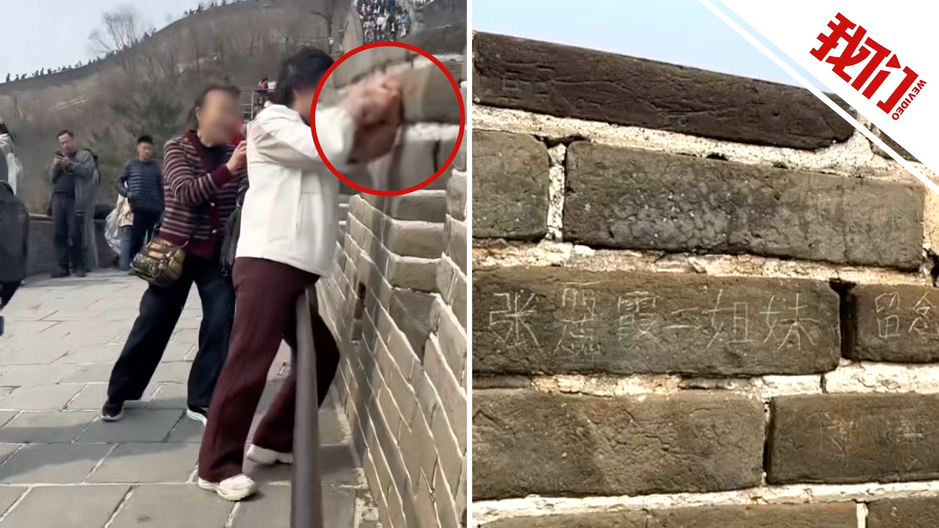 两名女子在北京八达岭长城墙体上刻字 管理处:相关部门正在处理