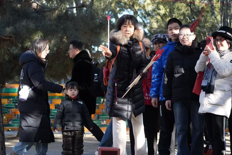 2月12日,正月十五元宵佳节,颐和园内张灯结彩,游客们在四大部洲、德和园等景点,通过赏民俗、猜灯谜、绘花灯、看展览等活动,感受传统节日魅力。图为游客玩投壶游戏。