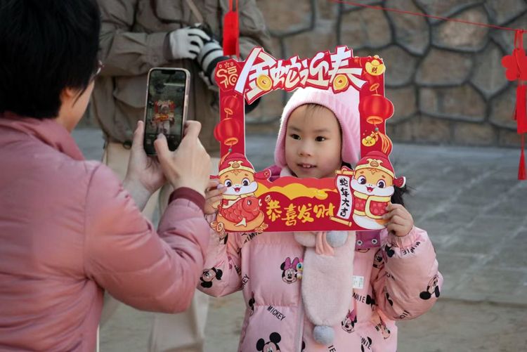 小游客举着“金蛇迎春”的牌子拍照。