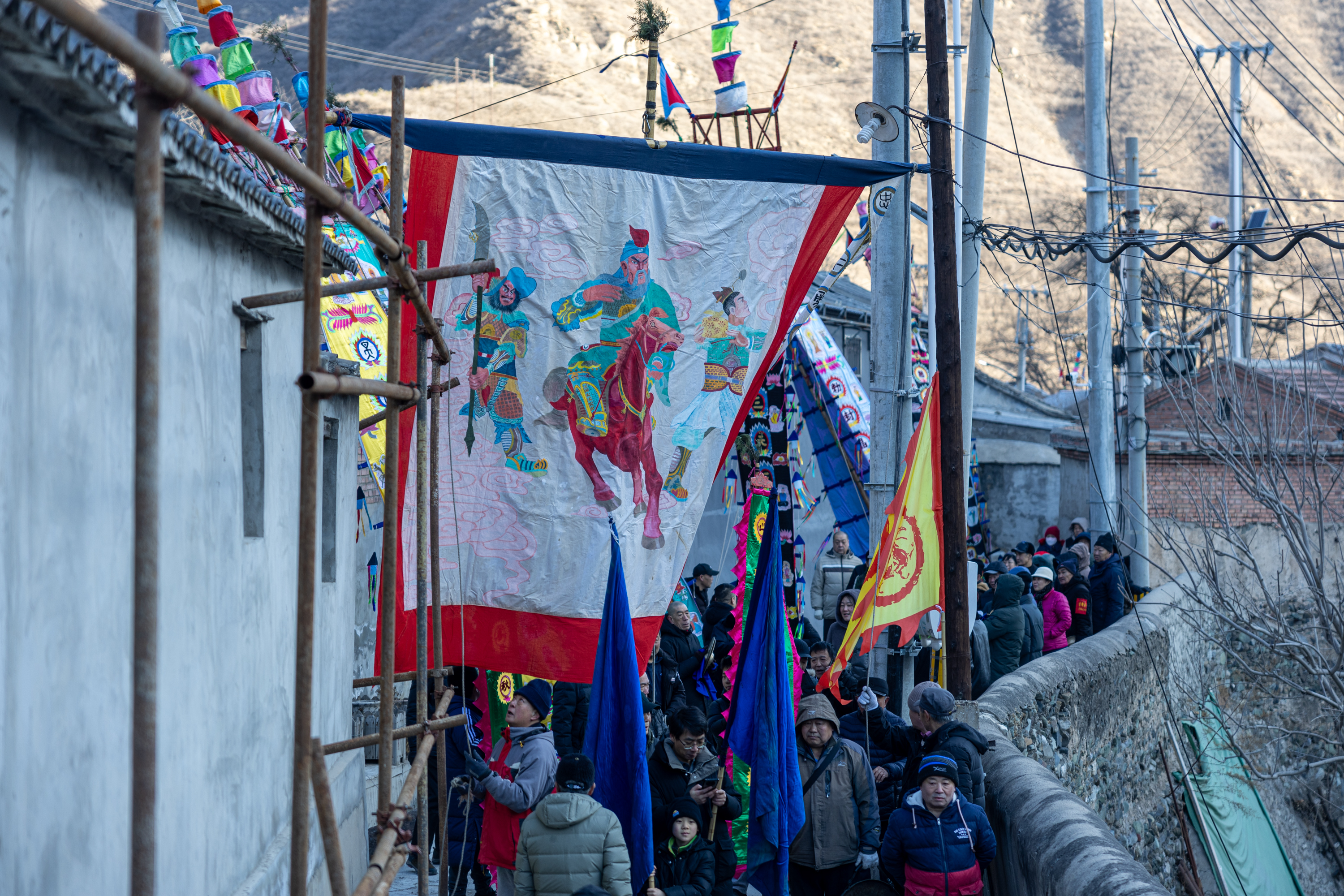 村民扛着幡旗走过古村落。新京报记者 王子诚 摄