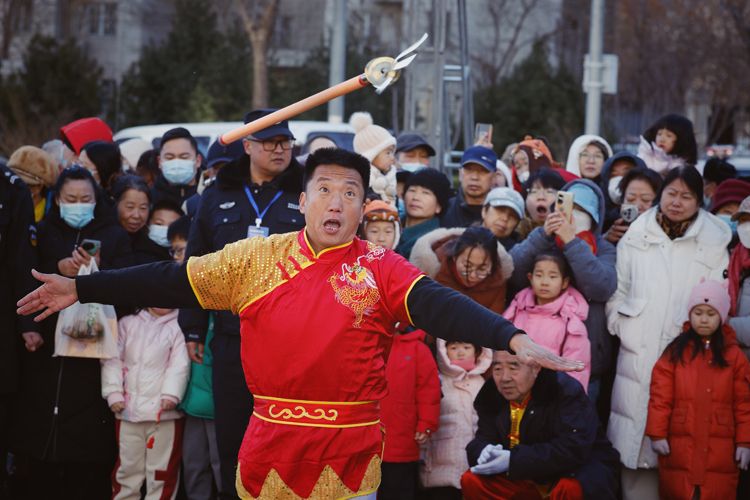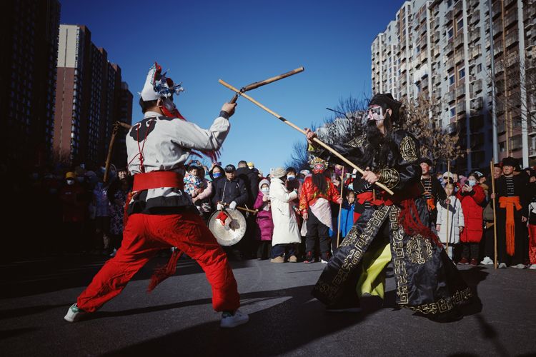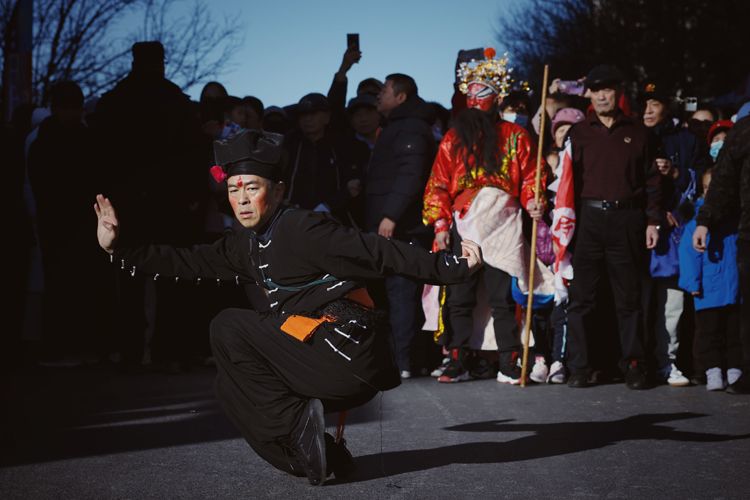 2月12日,大兴区天宫院庆丰路,居民围观天宫院地区传统民间花会“五虎圣会”表演。