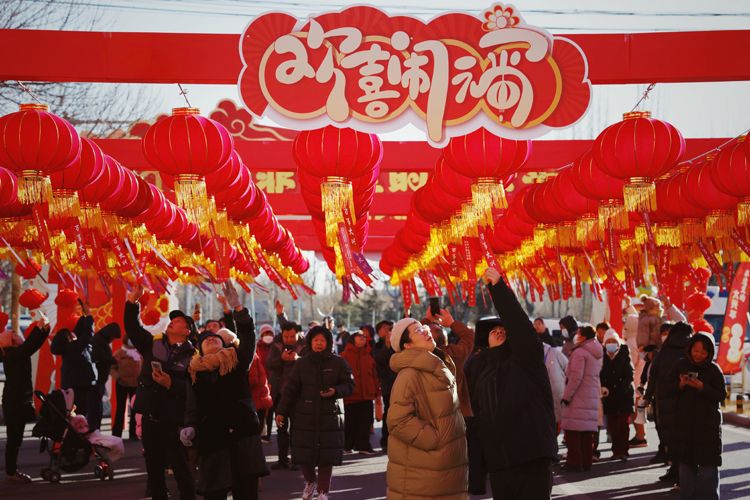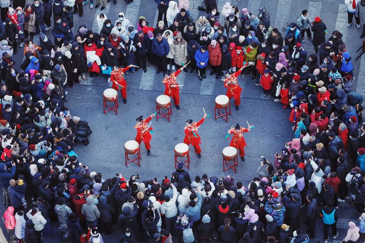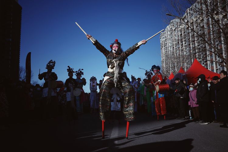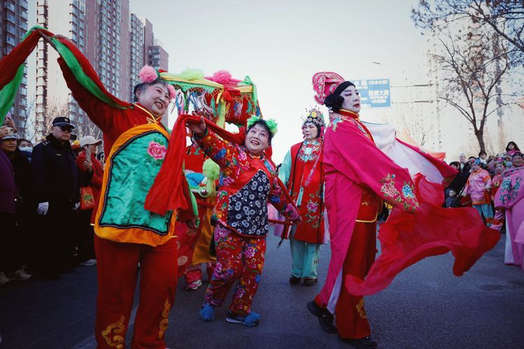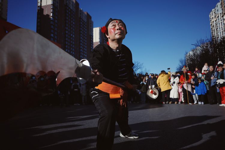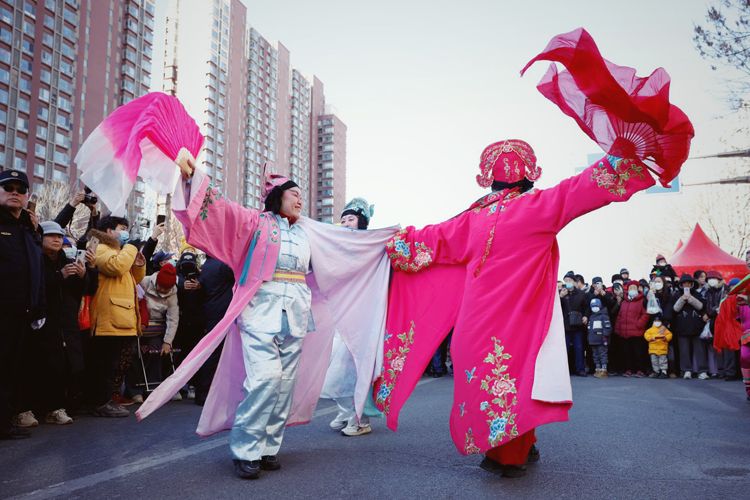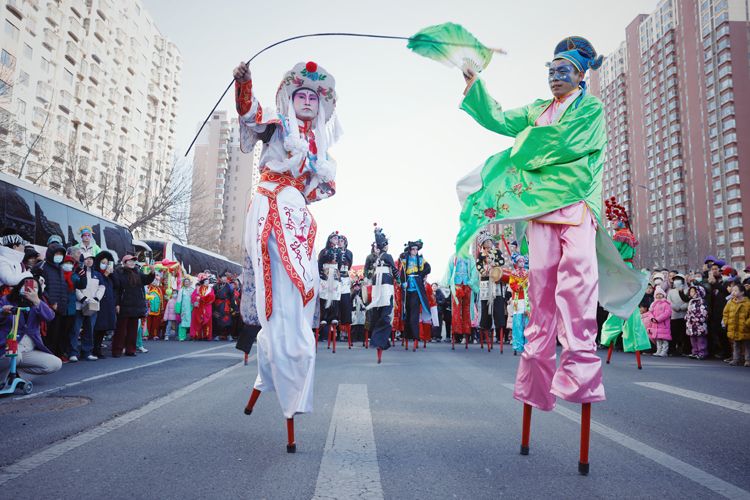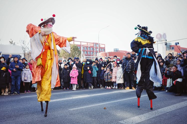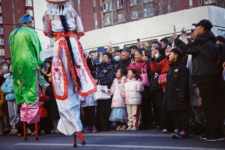 2月12日,大兴区天宫院庆丰路,高跷巡游受到居民欢迎。
