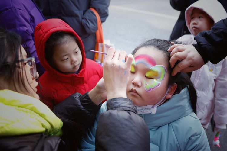 2月12日一早,71岁的程阿姨带着9岁的外孙来到社区北门,参加所在的天宫院街道举办的元宵节庆祝活动。和程阿姨一样的人不在少数,她所在的融汇社区有3172户,相邻的天宫院小区有2652户,居民们一早便扶老携幼,来到两个小区之间的庆丰路上,参加“非遗里的大兴年”暨“文化润天宫 非遗共传承”元宵节主题活动。