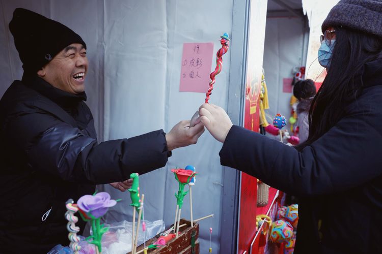 刚捏好的面人交到顾客手中。