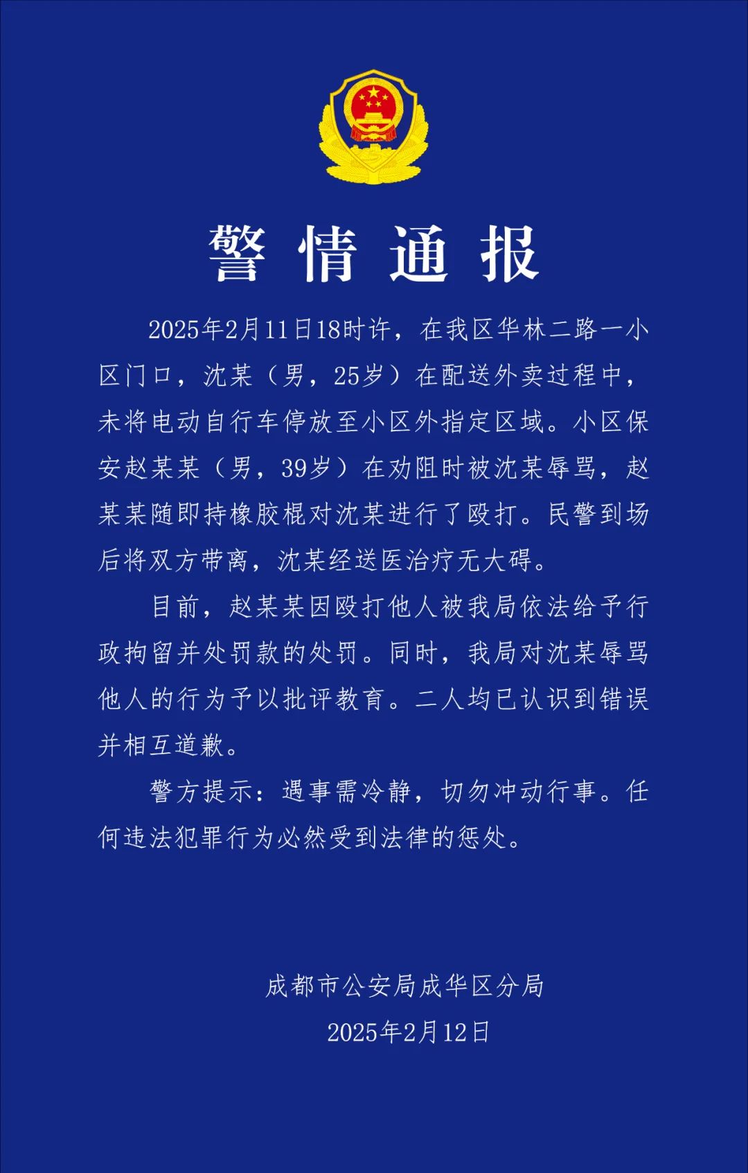 成都警方:一小区保安持棍殴打外卖员被行拘