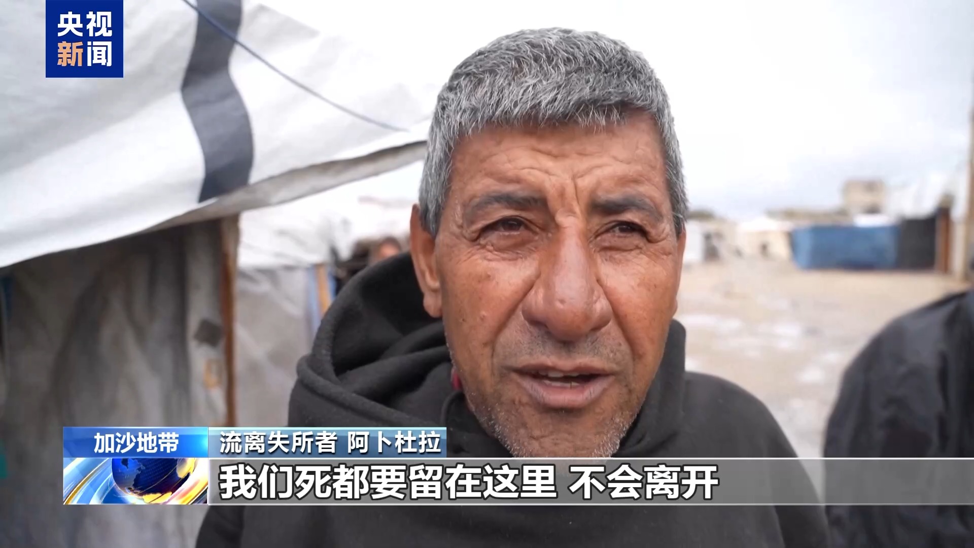 当地居民 哈莫:美国的政策想要把我们驱逐出去,有的去埃及,有的去约旦,有的去科威特,还有我不知道的地方。但我们不会离开,我们会留在这里,留在废墟之间,我们要留在自己的家园,留在加沙。就算美国总统给我们整个世界也不行,我们要留下来,就坐在自己的家门前。