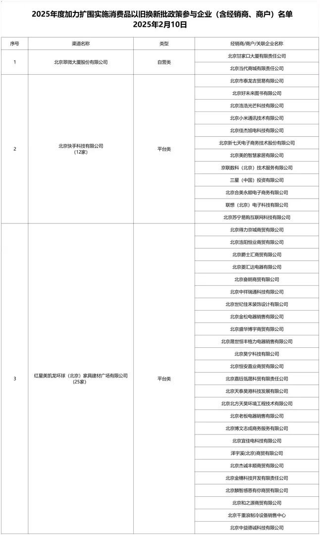 新京报讯 据“北京发布”微信公众号消息,2月12日,北京市商务局发布关于公布2025年度加力扩围实施消费品以旧换新政策参与企业的通知。根据《关于公开征集2025年度加力扩围实施消费品以旧换新政策参与企业的通知》规定,市商务局组织开展了2025年加力扩围实施消费品以旧换新政策参与企业的征集工作。经综合评议,确定北京翠微大厦股份有限公司等3家企业(含自营类企业和渠道商)为2025年度加力扩围实施消费品以旧换新政策第三批参与企业。按照参与企业动态增补机制,新增北京美的智慧家居有限公司为阿里巴巴(北京)软件服务有限公司的政策参与商户,自2月11日起参与政策实施。