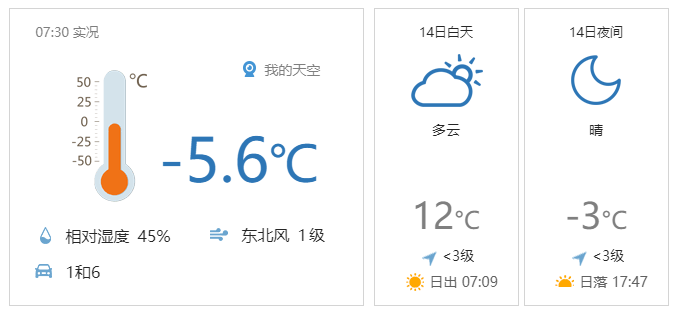今天白天晴转多云,北转南风二三级,最高气温12℃;夜间多云转晴,南转北风一二级,最低气温-3℃。