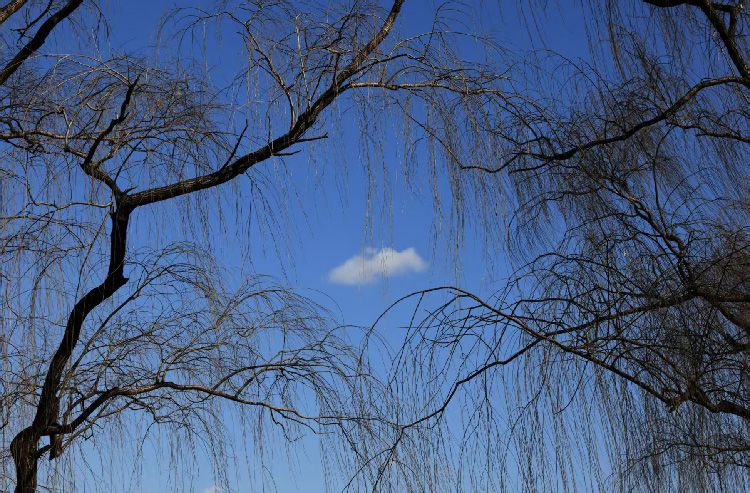 2月16日,紫竹院公园,一朵白云在随风轻舞的柳条间浮现。