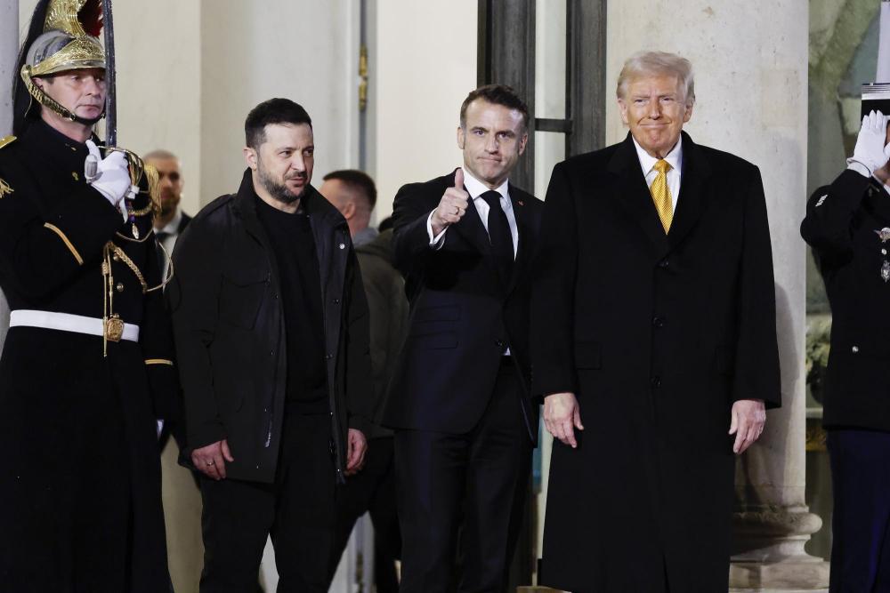 2024年12月7日,法国总统马克龙(左三)与美国当选总统特朗普(右)和乌克兰总统泽连斯基(左二)会晤后走出爱丽舍宫。新华社发(亨利·施瓦茨摄)