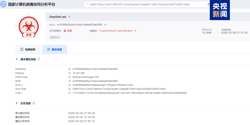 据央视新闻消息,近日,国家计算机病毒应急处理中心和计算机病毒防治技术国家工程实验室依托国家计算机病毒协同分析平台在我国境内捕获发现仿冒DeepSeek官方App的安卓平台手机木马病毒。