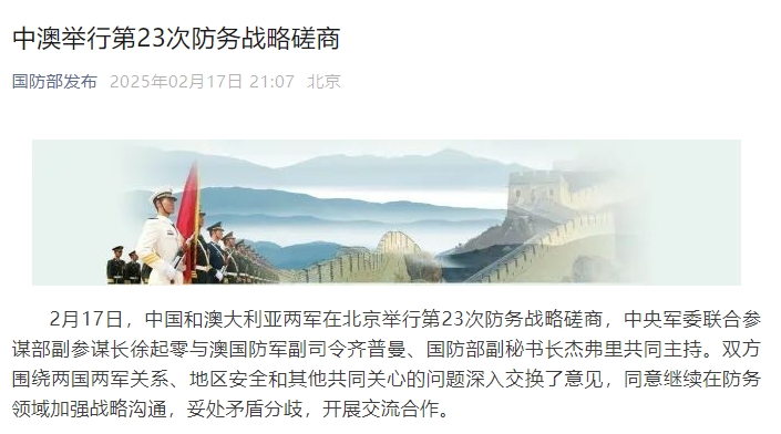 新京报讯 据国防部发布微信公众号消息,2月17日,中国和澳大利亚两军在北京举行第23次防务战略磋商,中央军委联合参谋部副参谋长徐起零与澳国防军副司令齐普曼、国防部副秘书长杰弗里共同主持。双方围绕两国两军关系、地区安全和其他共同关心的问题深入交换了意见,同意继续在防务领域加强战略沟通,妥处矛盾分歧,开展交流合作。