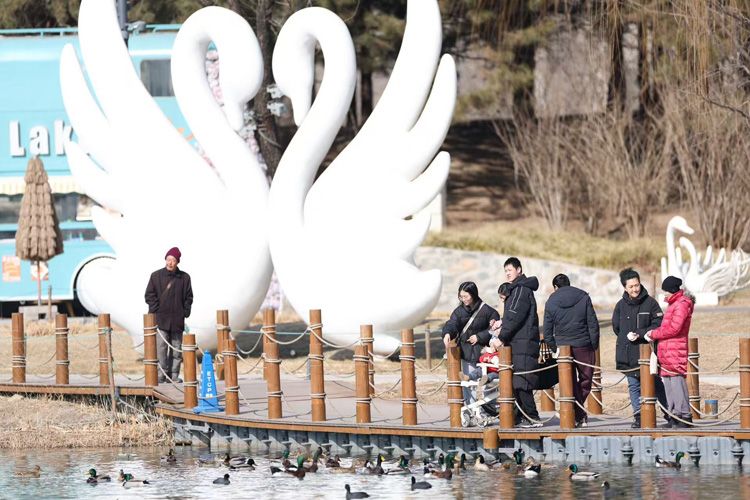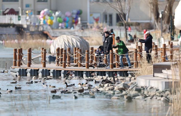 2月19日,北京天气晴朗,暖阳相伴,市民纷纷走出家门,来到户外畅享美好休闲时光。朝阳公园内,市民拍摄在湖中嬉戏的鸭子。