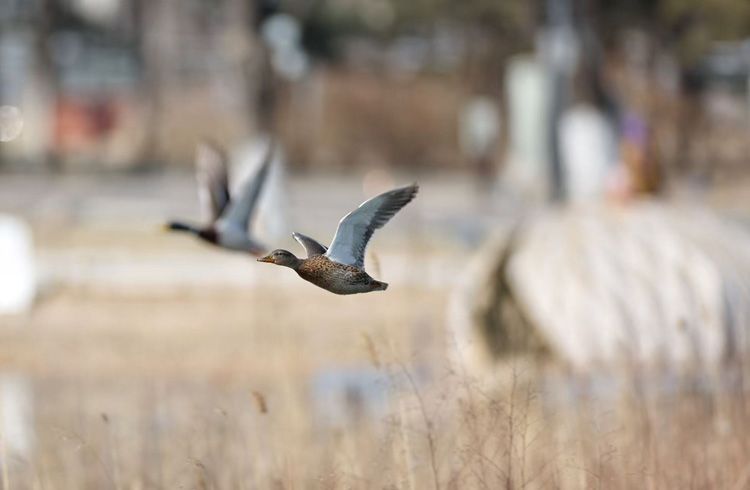 两只鸭子扑棱着翅膀,从野鸭岛破水而起。