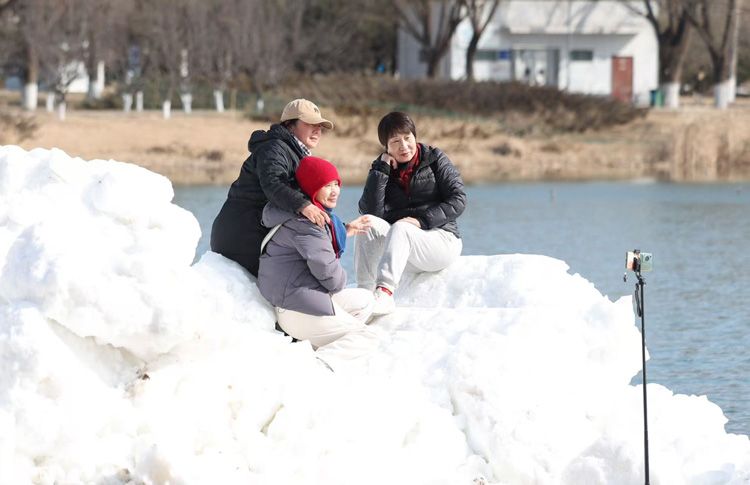 市民在人造雪上拍照留念。