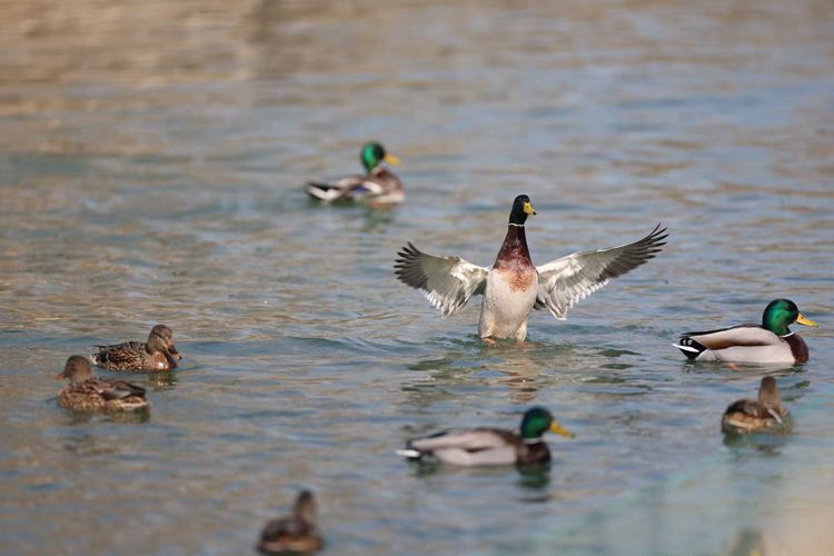 鸭子在湖面嬉戏。