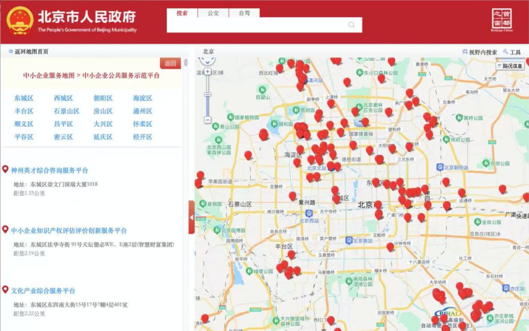 北京市中小企业可在中小企业服务地图中一键查找服务载体。网站截图