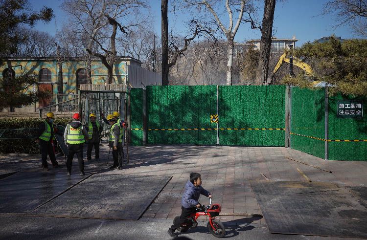 2月20日,北京动物园,长颈鹿馆(东馆)周围竖起的施工提醒。