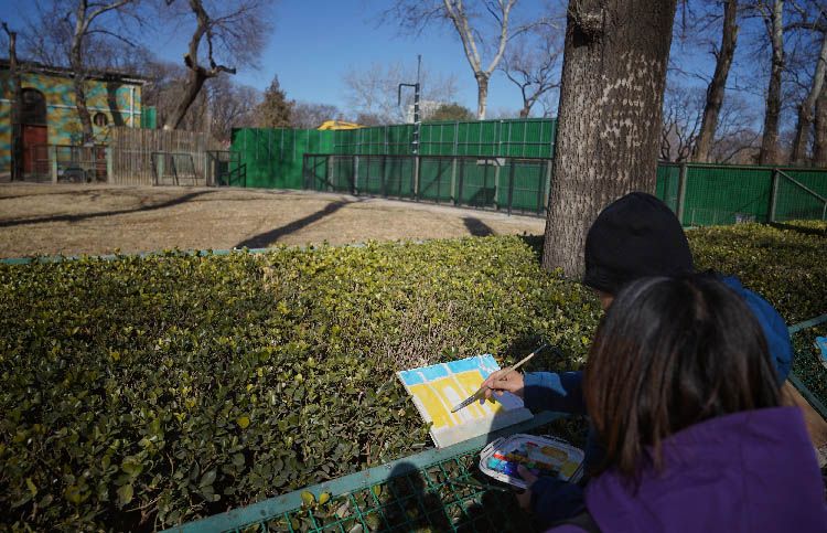 长颈鹿馆的外墙是亮丽的黄色,蓝绿色条纹点缀其间,充满童趣和活力。一位游客专程过来写生,留下画作以纪念。