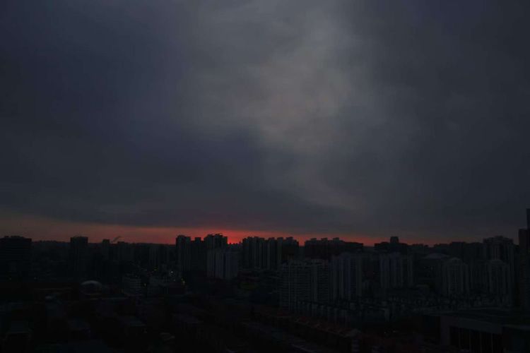 2月21日6时53分,北京天空多云,一抹橙红色的光芒在东方出现。