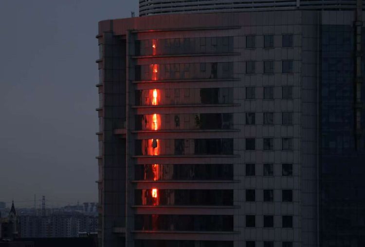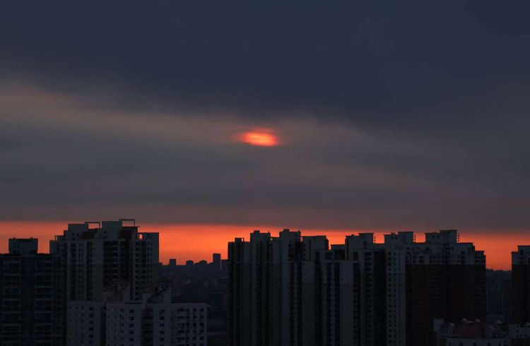 7时6分,旭日钻入云层,周围的云都染成了红色。