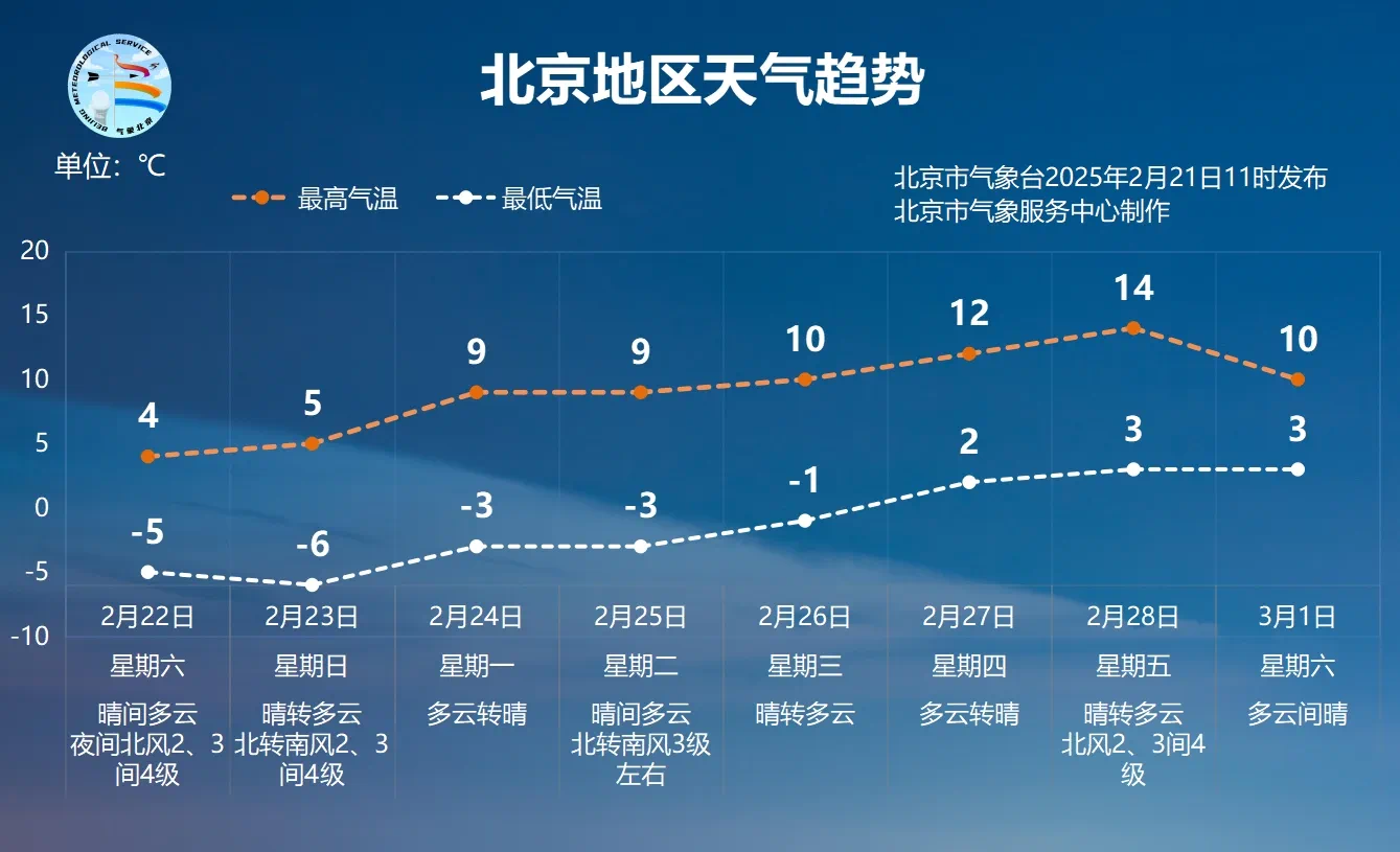 下周北京气温明显回升,春的脚步越来越近。预计2月22日至3月1日,白天最高气温4℃至14℃,夜间最低气温为-6℃至3℃。