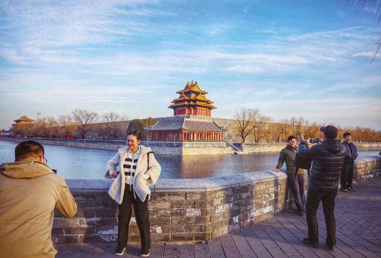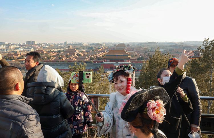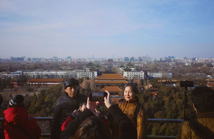 2月24日,北京景山,游客与北中轴线合影。