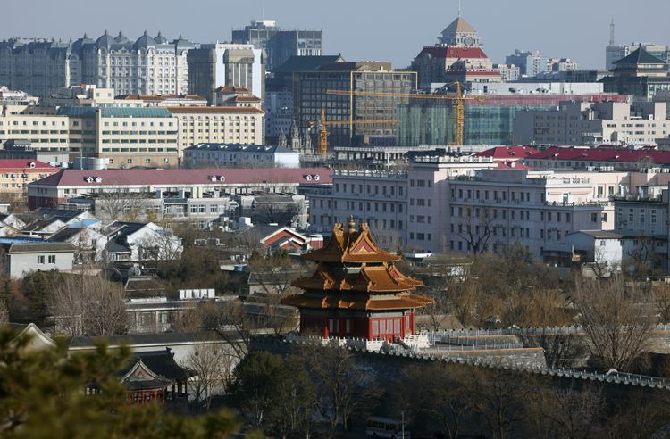 2月24日,故宫角楼静静矗立,与现代化城市建筑相互映衬。